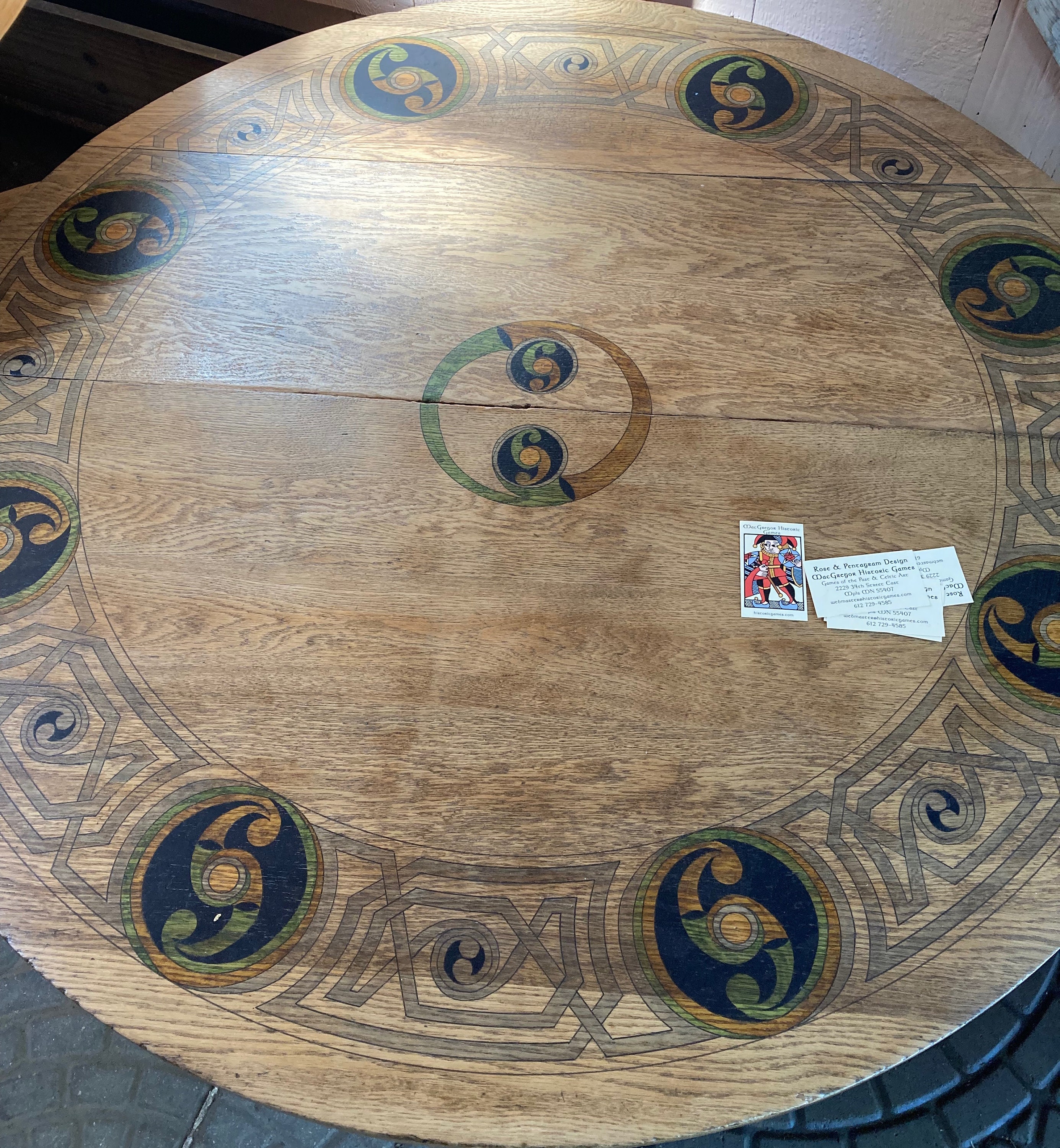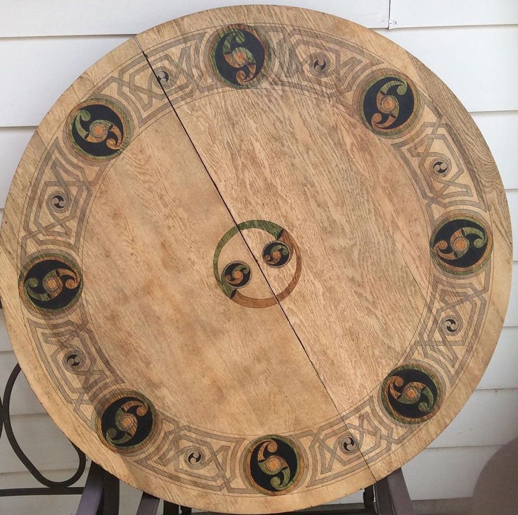 A matched set of a dinette and coffee table hand up-cycled with Celtic motifs and seals with multiple coats of polyurethane. Both are about 45 inches in diameter. $1000 as a pair $600 individually