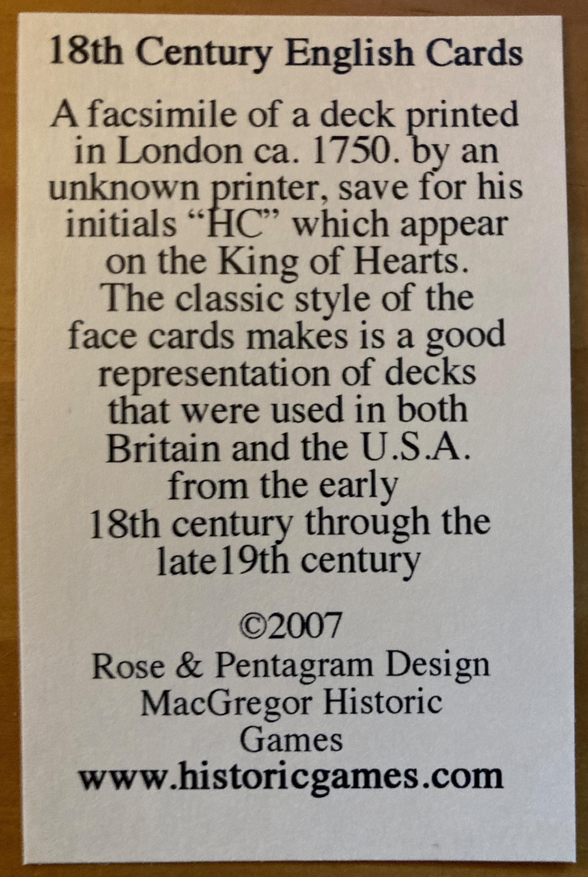 A reproduction of a 52 card deck from about 1750. The initials “HC” on the King of Hearts provide a clue to the unknown artist who made the original printing blocks. The classic style of this deck makes it a good representative of decks used in both Britain and the U.S.A. from the early 18th century up to the late 19th century. Although jokers were not used until the 1800's, we have included our own jokers inspired by the face cards for games that require them.