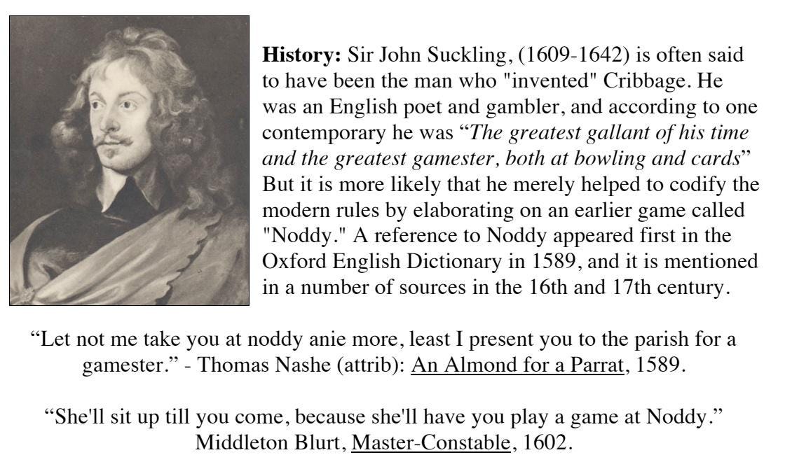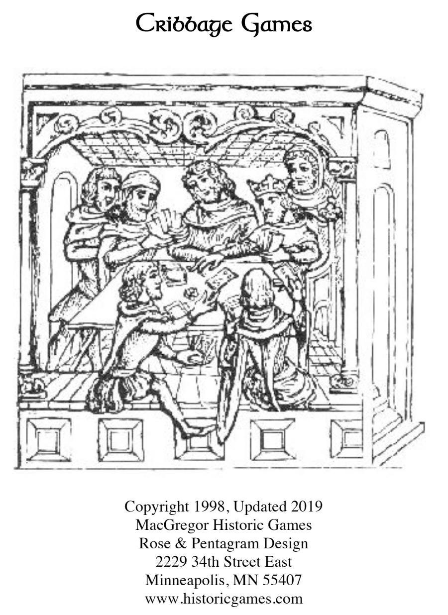 The earliest pre-cursor to modern Cribbage is called "Noddy" and dates back to the 1500's. We've included that, some 17th century variations, as well as modern versions ranging from solitaire Cribbage, on up to 6 players. Updated with over 30 VARIATIONS on Cribbage! PDF format.