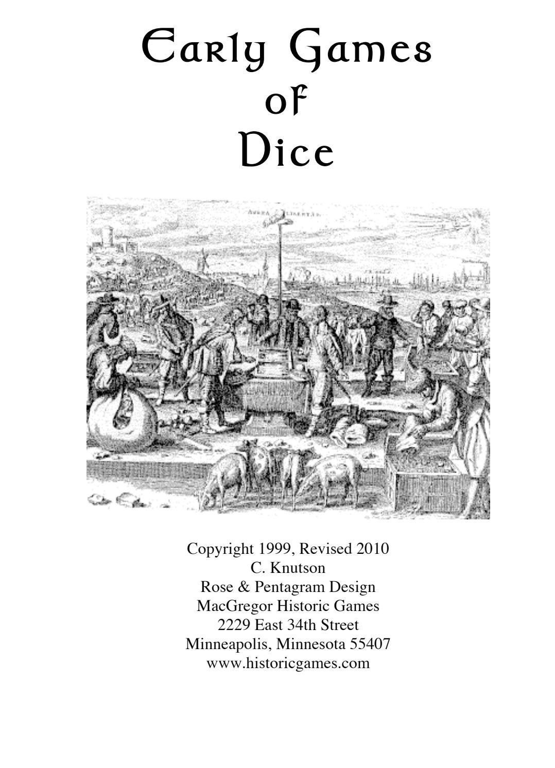 Our own collection of early dice games including several translated from Alphonso X's Book of Games (circa 1280 A.D) Includes a look at the history of dice, rules for playing dice with sheep knucklebones. Download-able in PDF format.