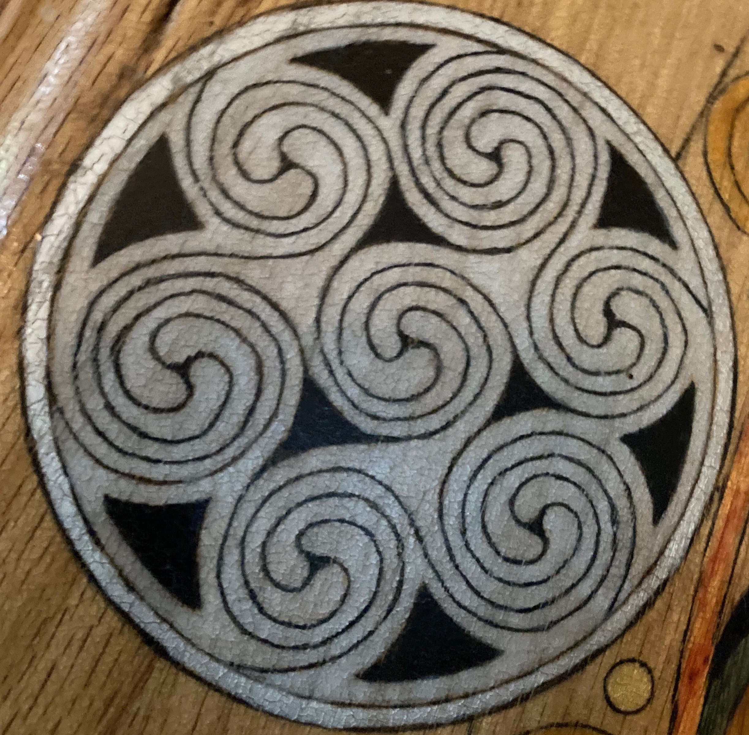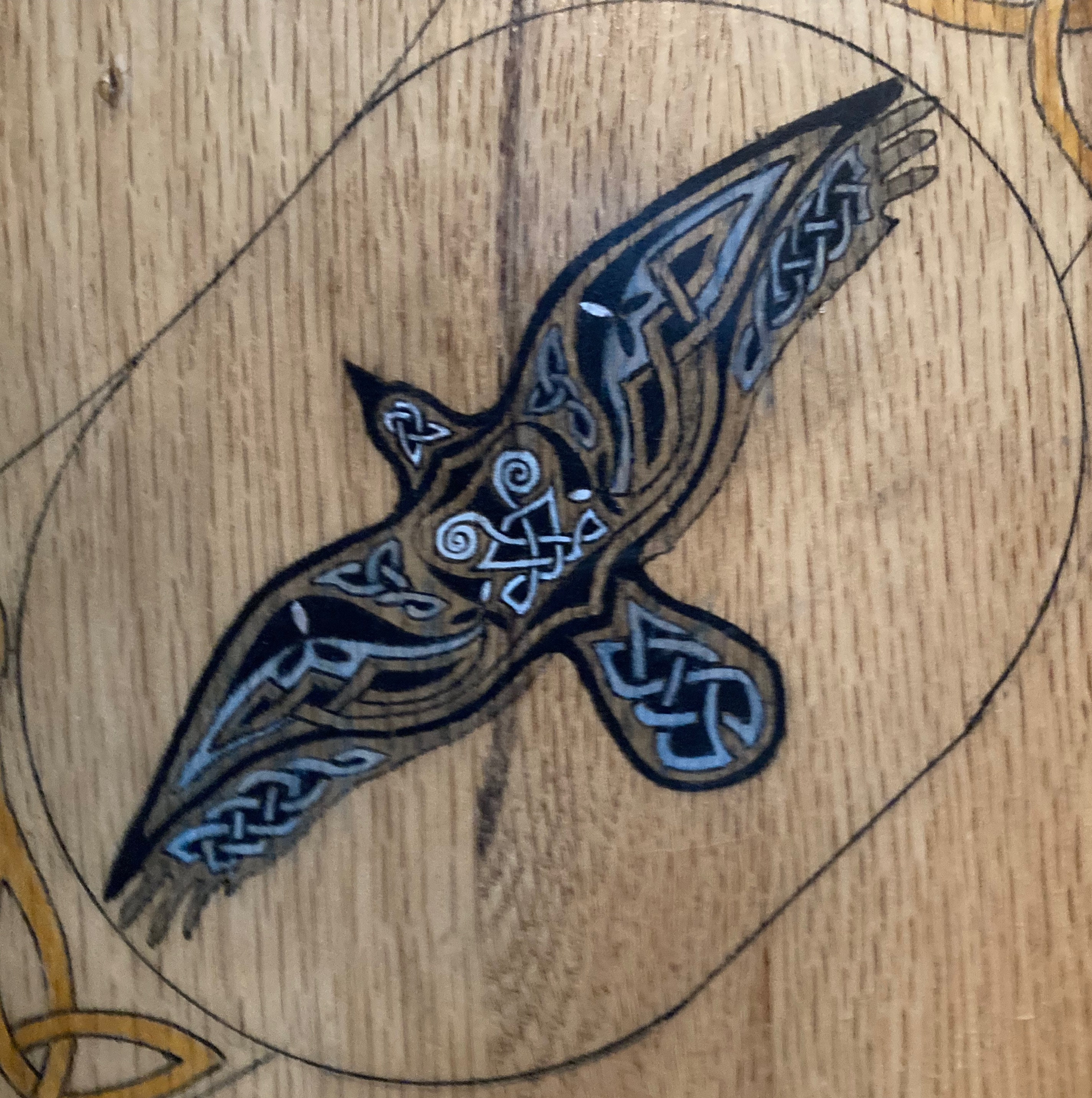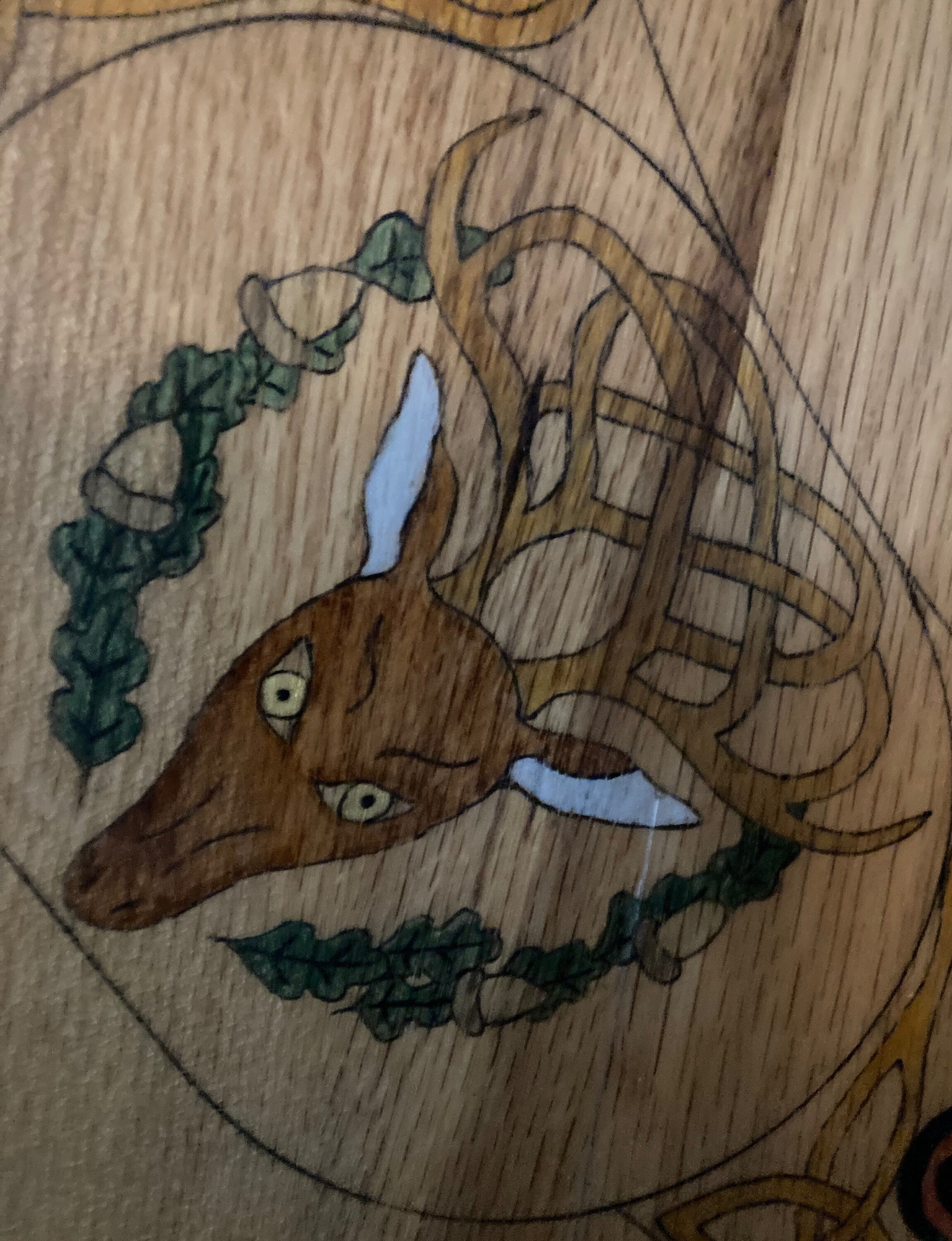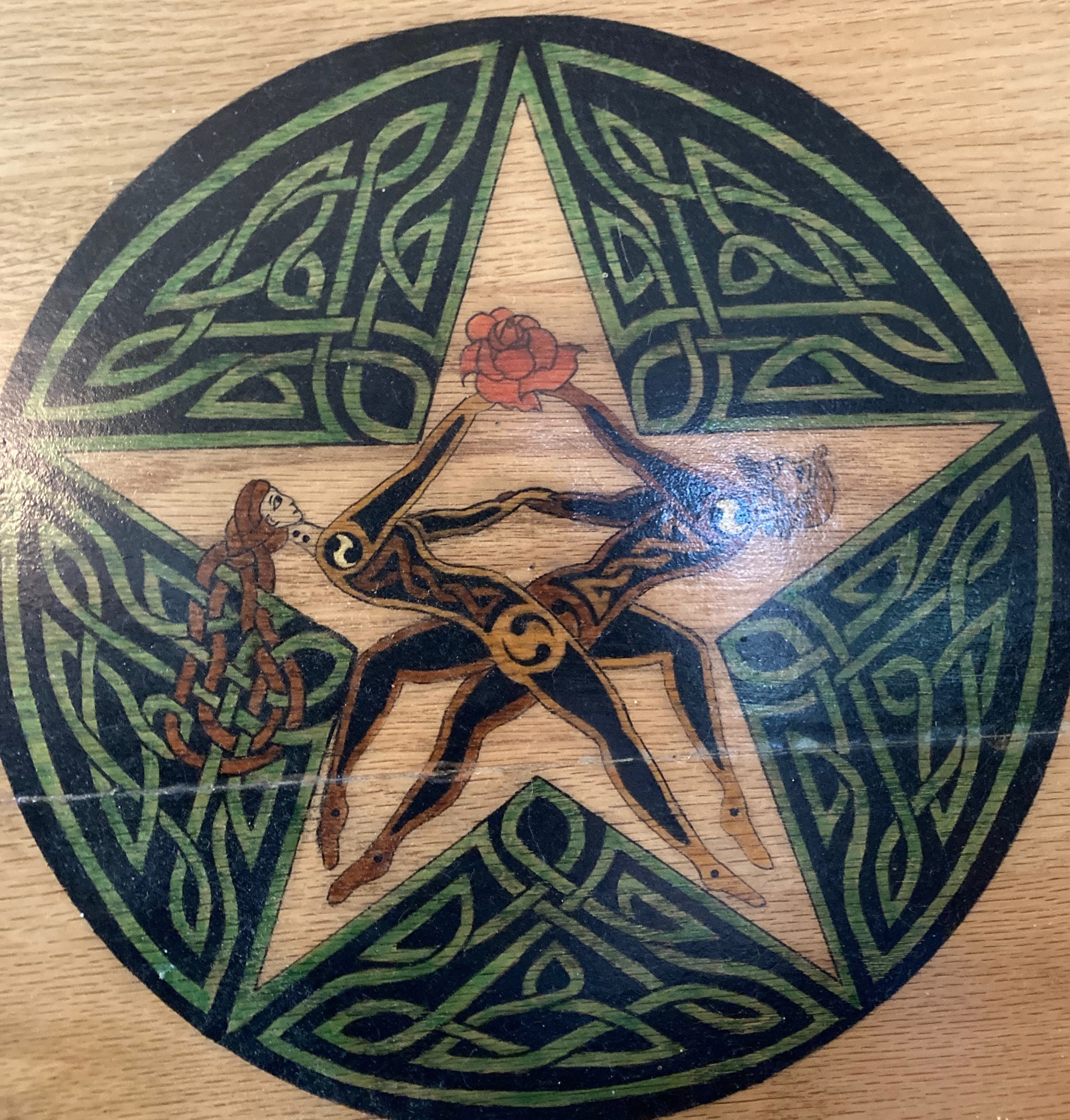 A used oak table that I upcycled with Celtic motifs. The center design features my original "Lover's Pentagram" with a man and woman intertwined and holding a rose. The border features the phases of the moon plus a stag, a raven, salmon, and dragons to symbolize earth, air, water and fire.
